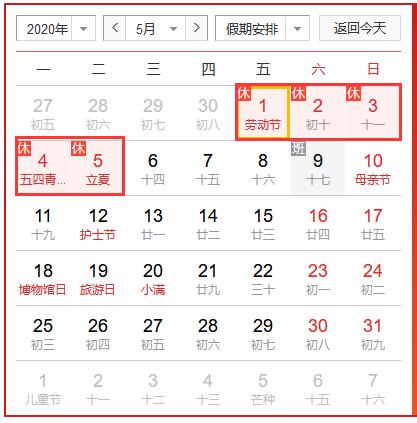 放假时间:2020年5月1日(周五)——2020年5月5日(周二),共三天。