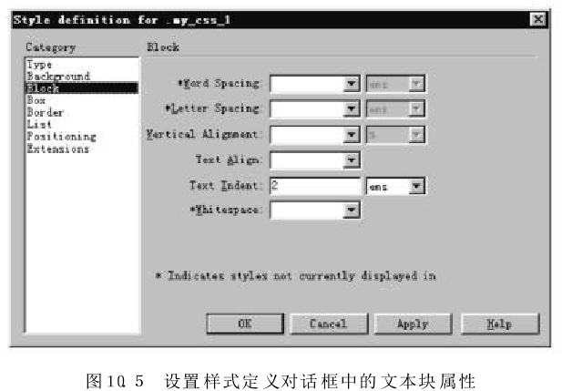 在图10.4所示对话框的"Category"列表框中,选择"Block"项,出现"Block"设置面板,设置mycss_1样式的属性,如图10.5所示,单击“OK"按钮。在如图10.2所示的CSS样式面板上将出现新定义的样式my-css_1.