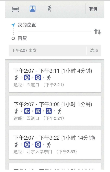 在GoogleMaps中,如果用户想查询路线,就一定要输入起点和终点,这是无法省略的过程。但是在查询路线时,GoogleMaps会利用定位功能自动将起点定位为“我的位置",减少用户的操作,如图6-36所示。